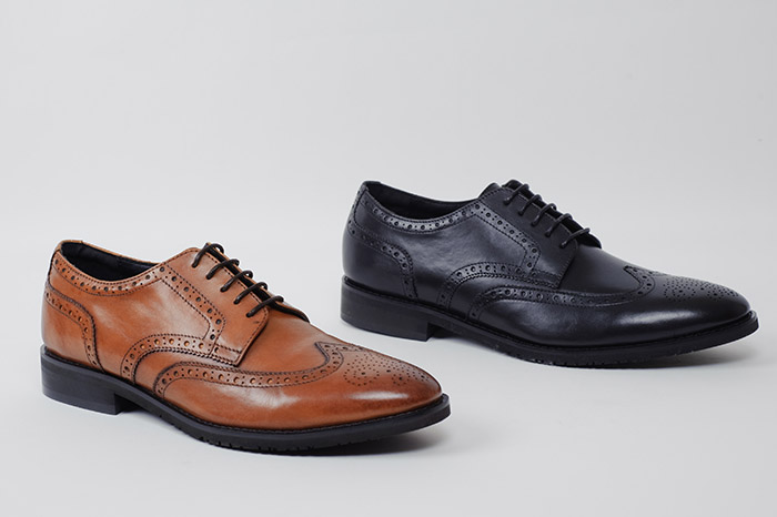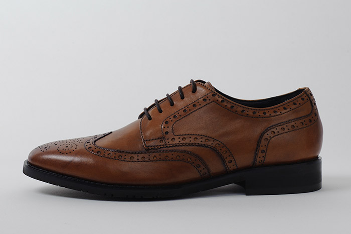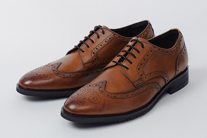 HY-06 外羽根穴飾(ウィングチップ) 甲部分からつま先にかけてW(ウィング)に切り替えが入ったデザイン。つま先の模様は「メダリオン」、装飾の穴一つ一つは「ブローグ」と呼びます。踵側から見ると、M字のラインが「おかめさん」の髪型に似ていることから、日本では「オカメ」とも言われています。昔からゴルフ場などで履かれていた、クラシック感のあるシューズです。 COLOR: BRN、BLK 一覧へ戻る